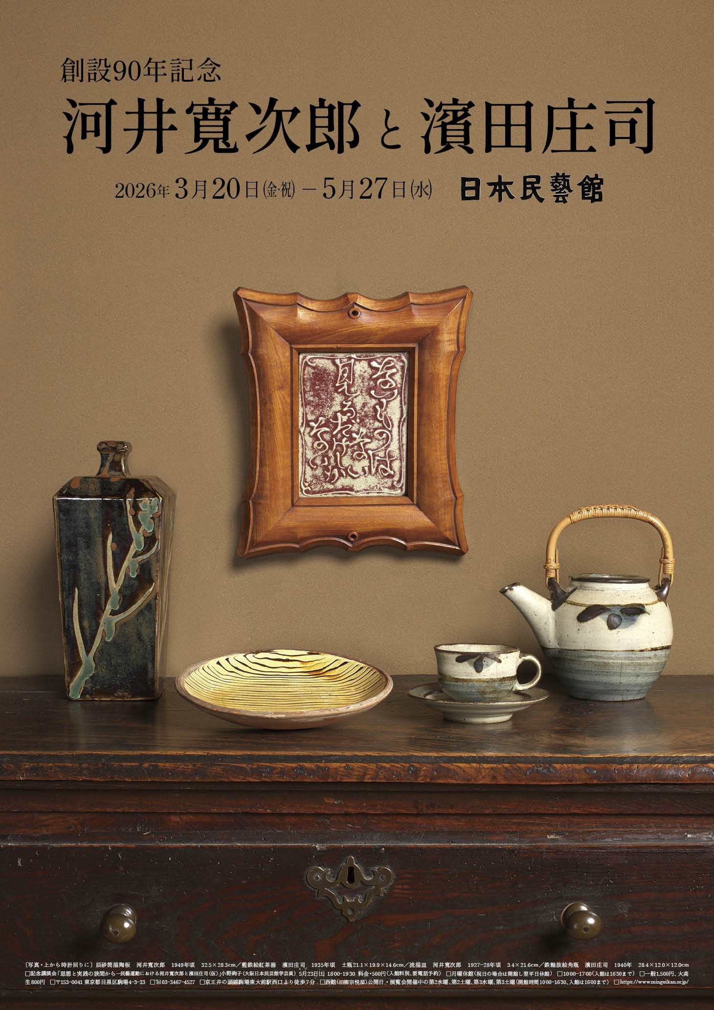 陶芸家の河井寬次郎(1890~1966)と濱田庄司(1894~1978)は、東京高等工業学校(現・東京科学大学)で出会い、生涯にわたって親交を深めました。二人は柳宗悦(1889~1961)の思想に共鳴し活動する中で、1925年に柳と共に「民衆的工藝」略して「民藝」を造語します。創設90年記念第一回の特別展では、「民藝」の出発点に立っていた河井・濱田両名の作品を展示し、それぞれの魅力を紹介します。